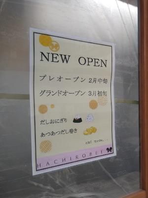 2月中旬プレオープン、グランドオープンは3月初旬とのこと。オープンを告知する張り紙には、「だしおにぎり」と「あつあつだし巻き」and more…と書かれていたので、おそらくこの2つがメインメニューになるのかもしれませんね。