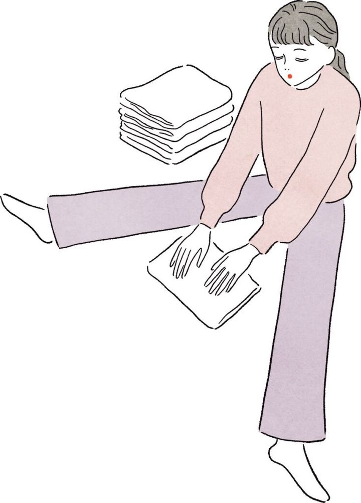 両脚を無理のない範囲で開いて床に座り、上半身を左右に動かしたりしながら洗濯物を畳む。股関節がやわらかくストレッチされ、下半身の血流もアップ。