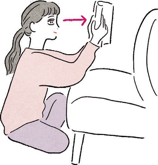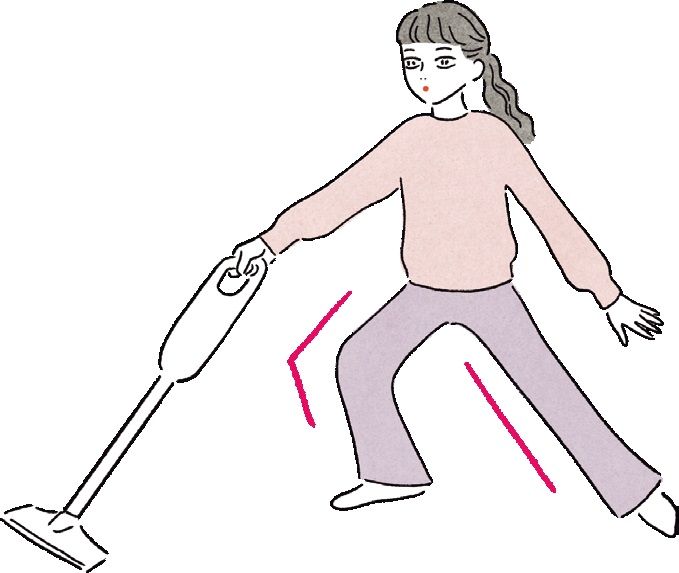 掃除機を使う時は、腕の力だけでなくカラダ全体で操作すると運動量が大幅アップ。ポイントは、腰を落として重心をセンターに置くこと。下半身の強化にも効果的!