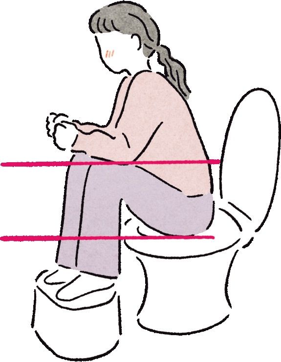 低めの踏み台などを利用して、膝がお尻より高くなるように座る。上半身はやや前傾姿勢が。腹筋に力が入りやすくなり、便の通りがスムーズになる。