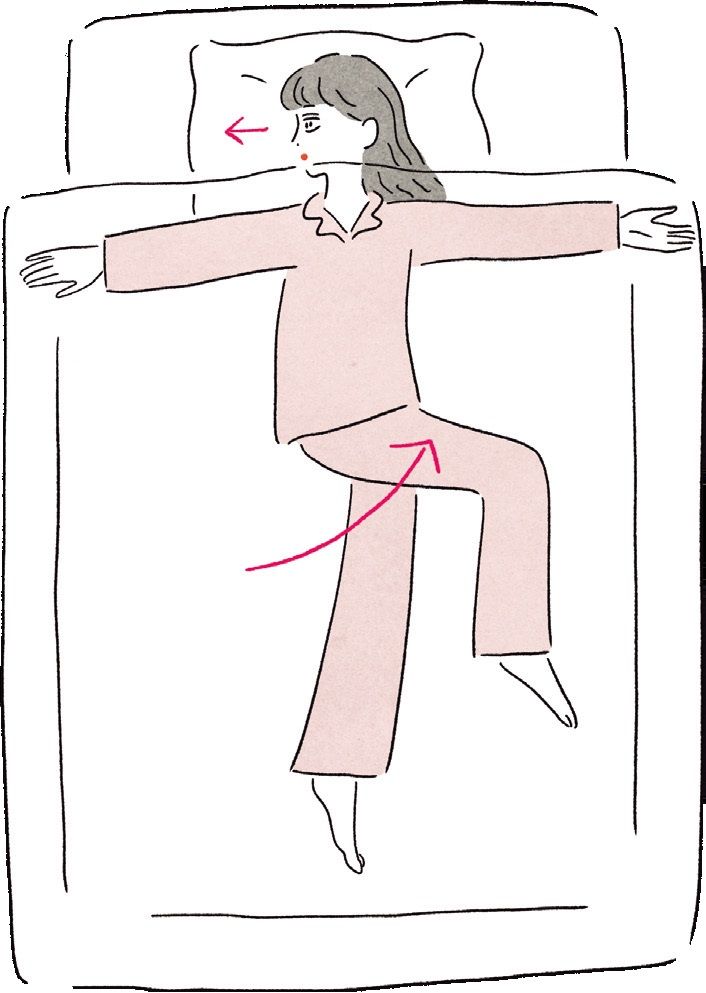 顔は右向きにし、両手を大きく開き、右膝を曲げ、右脚が左脚の外側に来るように倒し、ゆっくり腰をひねる。脇腹~お尻が伸びているのを感じて。反対も同様に。