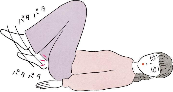 いつものテレビタイムにも一工夫を。床に仰向けになり、膝を曲げて脚を持ち上げ、太ももの裏側を左右のかかとでトントン刺激。