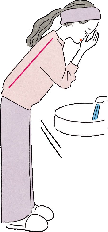 顔を洗う時は、背筋を一直線に伸ばしたまま、骨盤を支点として折るように上体を傾けると、もも裏のトレーニングに。反り腰にならないように注意。