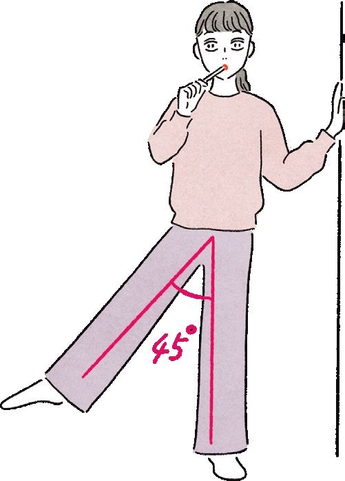 椅子や壁に手を添えてまっすぐ立つ。お腹のコアを意識しながら、膝を曲げずに片脚を斜めにゆっくりと持ち上げて下ろす。左右10~20回ほど繰り返す。