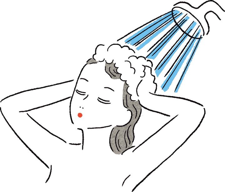 低い姿勢で前にかがむと、胸が閉じて肩回りがたくましくなるのでNG。シャワーは頭より高い位置にセットし、立ったまま胸を開いて、天井を見上げるように浴びる。