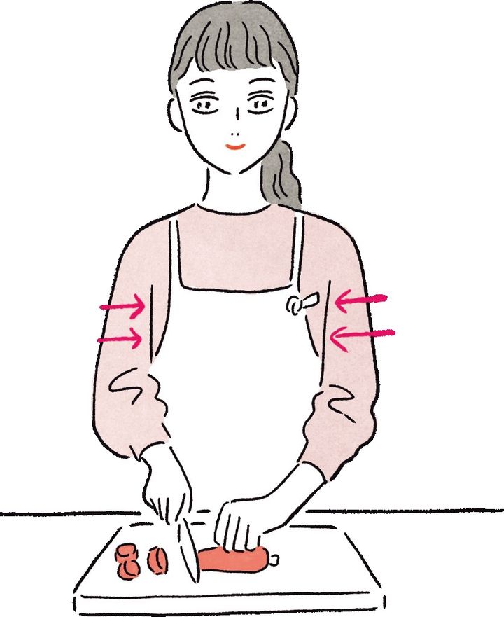 包丁で切るなどの作業をする際は、背筋をまっすぐ伸ばして両ワキを締めることを意識。自然と肩甲骨が寄って姿勢が整い、背中のラインも美しくなる。