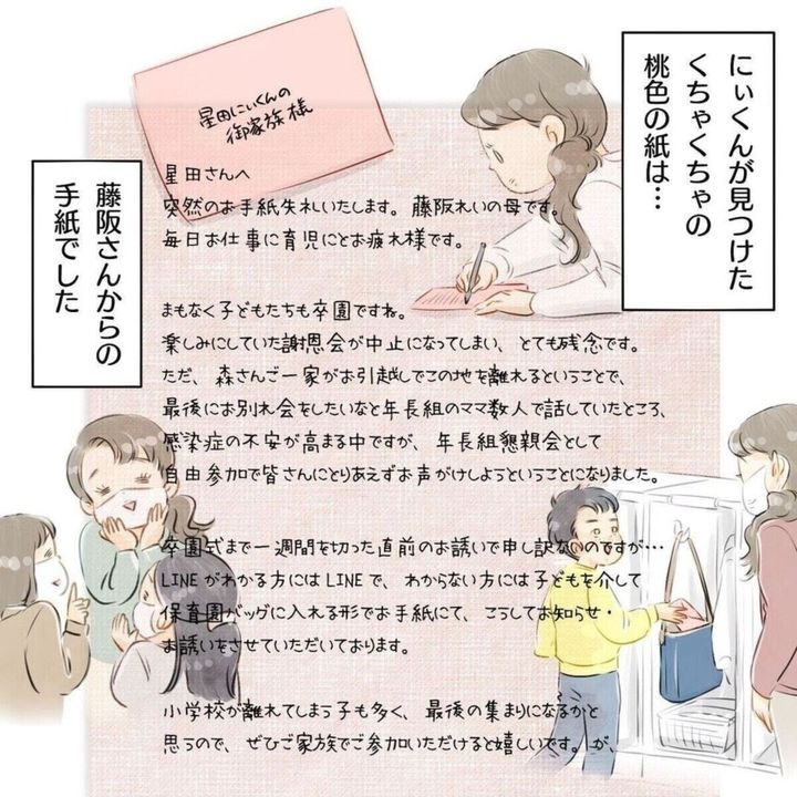 沈んだ気持ちを払しょくしようと部屋を片付けていると、長男・にぃくんがおもちゃ箱の中からクシャクシャに丸められた紙を見つけました。なんとそれは、藤阪さんからの懇親会へのお誘いの丁寧な手紙…。星田さんは知らぬ間に誘いを無視してしまっていたのです。