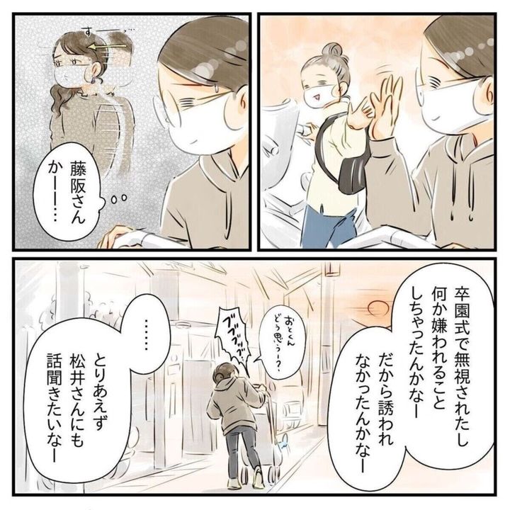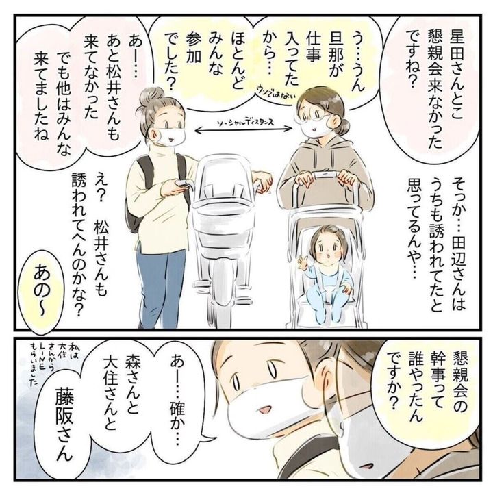 そこで懇親会について聞いてみると、幹事は卒園式で無視された藤阪さんだと判明。ほかのママ友にも話を聞いてみると、やはり誘われていないのは自分だけだった様子。
