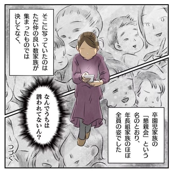 卒園式が終了し、いたたまれない気持ちで早々に園を出た星田さん。家族で外食していても食事がのどを通らず、ふとママ友のSNSを見た星田さんは、卒園児家族がほぼそろった懇親会が開かれていることを知るのでした。