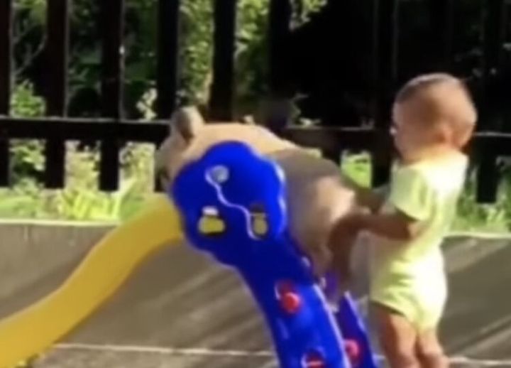 3. 「よいしょ、重っ!!」 愛犬をすべり台で遊ばせてあげたい赤ちゃんが可愛い。