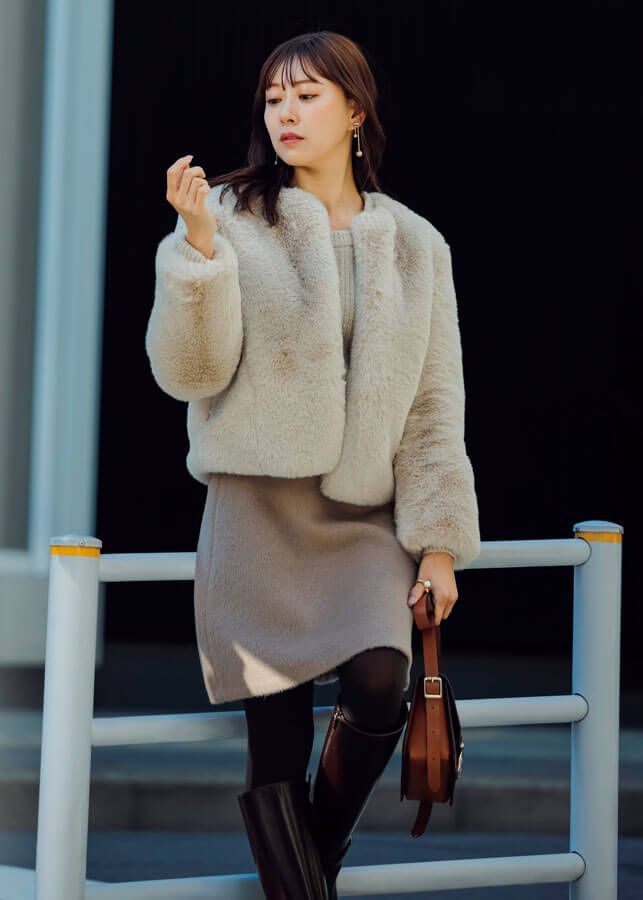 ファーアウター×ミニスカをエレガントに着こなしたいなら、ベージュのワントーンで上品にまとめて。バッグやタイツも同系色でまとめて品を底上げすれば、より大人っぽくキマります♡