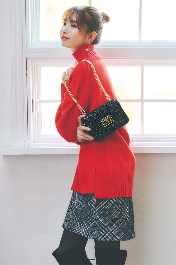 暗くなりがちな冬コーデには思い切って赤ニットを投入! カラーニット×ミニスカがカジュアルに転ばないように、パールピアスやラメバッグで上品なアクセントを。