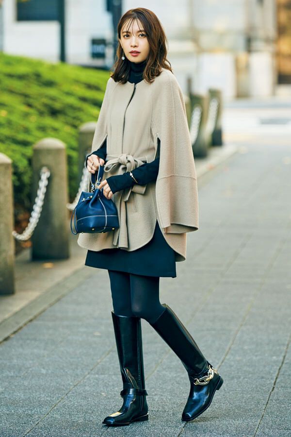ケープからのぞくブラックのミニ丈が大人レディな佇まい♡ シックな黒がケープの優美なフォルムを際立てます。
