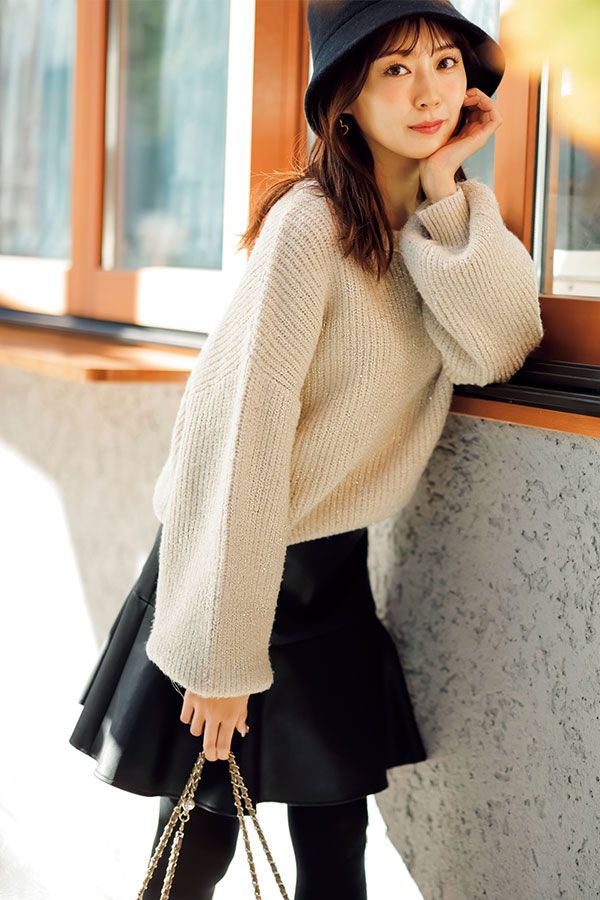 ミニスカをビターに寄せるエコレザーに、ラメニットで華感を足し算。辛口な色や素材を合わせたり、カジュアルなアイテムを投入することで甘さを抑えると大人味に♪
