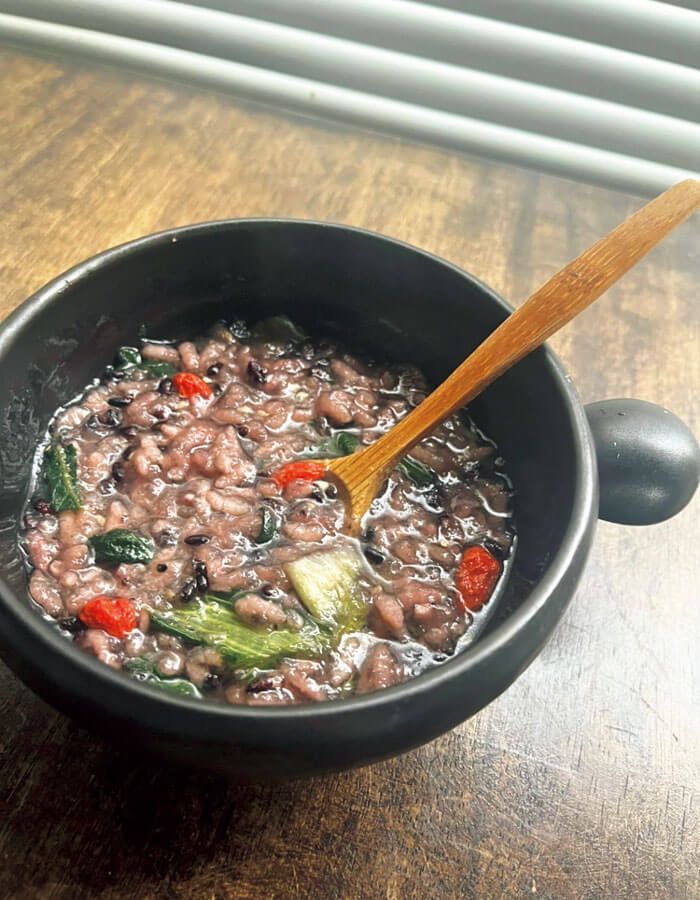 「朝の忙しい時間は、お湯を注ぐだけで簡単に作れる養命酒製造の五養粥が便利。体が温まり、胃に優しい!」(Flowers5期生 小田ほのかさん)