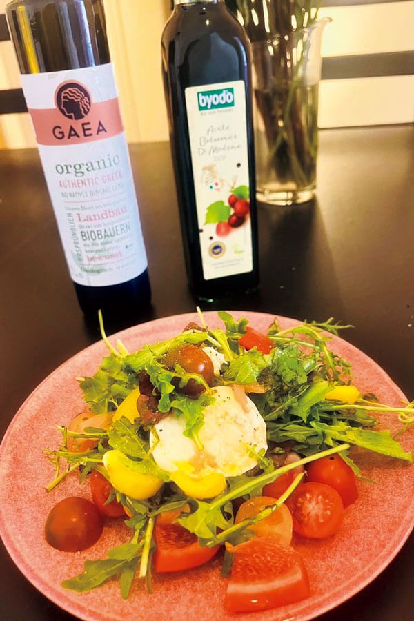「朝は食欲がないので、サラダのような軽いも のが多め。モッツァレラと彩り野菜のサラダはオリーブオイルと岩塩でシンプルに味付け」(Flowers5期生 花城さあやさん)