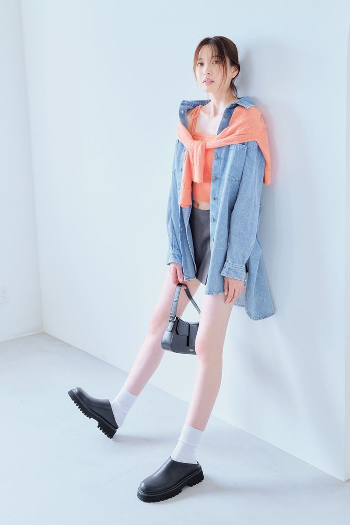 宮田聡子。ar1,2月合併号より ニットキャミ ソール¥6,490、肩にかけたニットカーディガン¥9,900/ココ ディール デニムシャツ¥18,700/プロヴォーク、バッグ¥28,600/ソル サナ、スリッポン¥22,000/モリーニ(ジャック・オブ・オール・トレーズ プレスルーム) スコート¥7,700/ラグア ジェム(バロックジャパンリミテッド) ソックス¥1,100/タビオ