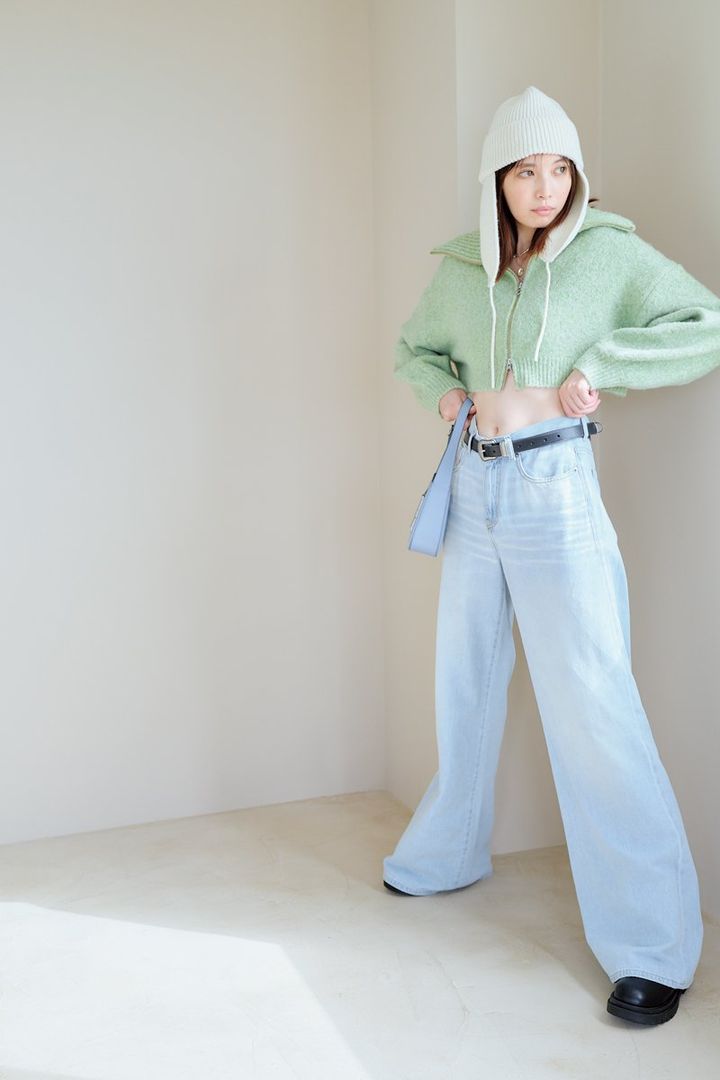 宮田聡子。ar1,2月合併号より ニット¥8,800/エヴリス(エヴリス 渋谷109店) デニム¥35,200/ディーゼル(ディーゼル ジャパン) 帽子¥7,920/オーバーライド(オーバーライド 神宮前) ベルト¥6,050/ラングラー(エドウイン・カスタマーサービス) バッグ¥9,900/チ ャールズ&キース(チャールズ&キース ジャパン) ネックレス(パール)¥2,640、(ペンダント)¥4,290/アネモネ(サンポークリエイト) ブーツ¥2,690/神戸レタス