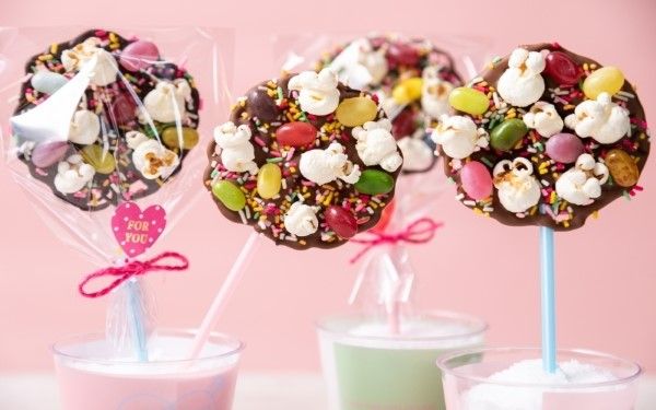 手軽な材料で写真映え抜群なロリポップチョコが完成! 小袋タイプのチョコを溶かし、即席チョコペンとして使います。ポップコーン、ゼリービーンズ、カラーシュガーなどで派手めにデコると◎。片手でも食べやすいです。しばらく飾っておいてもかわいいですね。