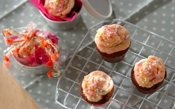 パーティーや女子会にはデコカップケーキがイチオシ。こちらはチョコレートケーキの上にピンク色のクリームチーズフロスティングを絞り、淡いパステルカラーが乙女心をくすぐります。バタークリームよりもさっぱりしていて、食べやすいですよ。
