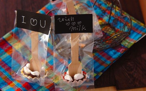 チョコレート液をカップに入れたら、マシュマロを散らして木製フォークを刺すという斬新なアイデアレシピ。冷蔵庫でしっかりと固めます。手を汚さずにそのまま食べられるほか、温かいミルクに溶かすとホットチョコレートにもなって万能です。