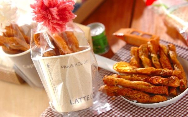 市販のパイシートにガーリックマヨを塗ったら、ねじって焼くだけ。しっかり味がついて、スナック感覚で食べられます。おつまみにもなって、これなら甘いものが苦手な方でも喜んでくれそうです。カップに詰めてラッピングするとおしゃれですね。