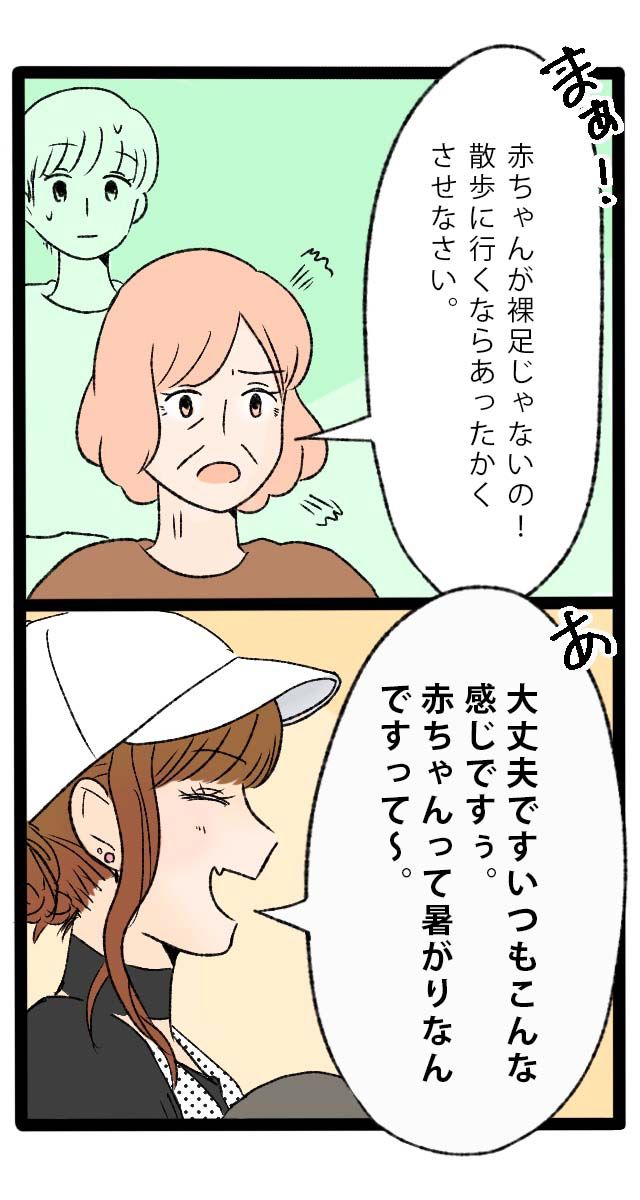 「まぁ、赤ちゃんが裸足じゃないの!散歩に行くならあったかくさせなさい!!」
