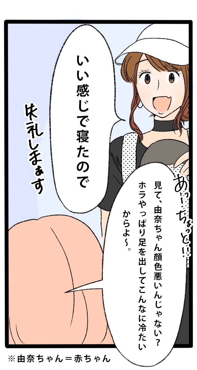 「いい感じで寝たので失礼しまぁす。」「あっ・・ちょっと!やっぱり顔色悪いんじゃない??ホラ。やっぱり。足を出してこんなに冷たいからよ~。」
