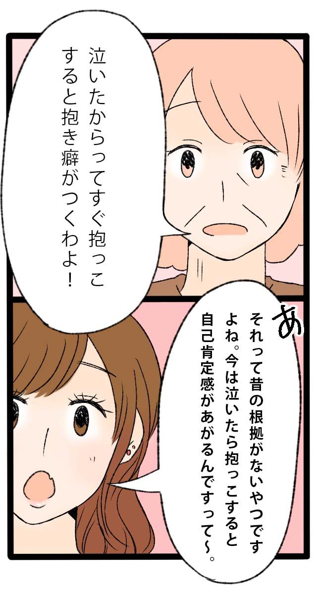 「あっ。それって昔の根拠のないやつですね~。今は泣いたら抱っこすると自己肯定感があがるんですって~。」