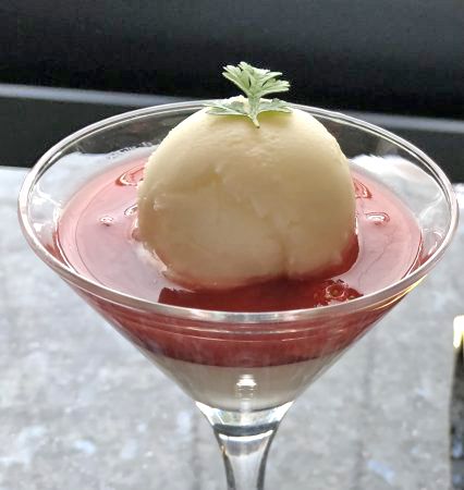 私はグラスに入った苺のヴェリーヌ スープ仕立てがとても口に合いました。ミルクのジェラートがのったスターアニスのプリンの中にもちもちのわらび餅とカット苺が入っています。苺ソースと相まって、その食感が最高でした。また食べたい!