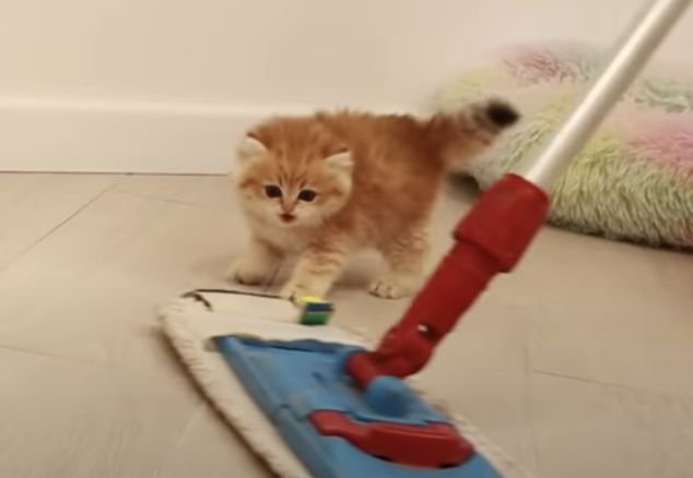 3. 「こっちに来るニャ〜!」モップが怖い子猫、小さい体で可愛く威嚇。