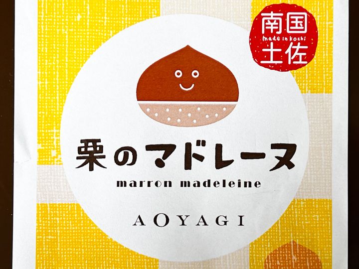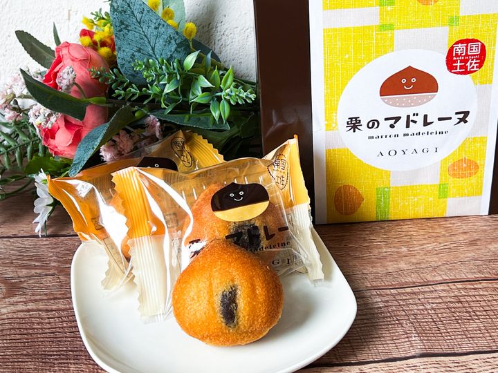 「栗のマドレーヌ」(6個入 税込1,135円)は、土佐に関連した和菓子や洋菓子を製造販売している「青柳」が販売する栗の焼き菓子。「青柳」の「土佐日記」は、昭和29年から親しまれている人気の和菓子で、土佐の代表的な銘菓です。