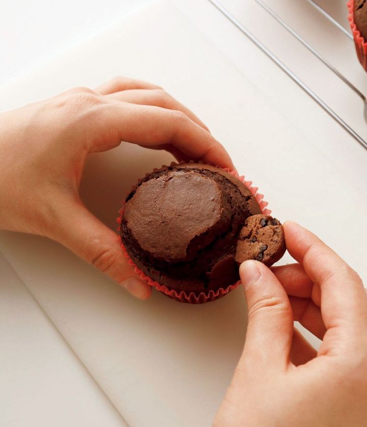マフィンの耳の位置にナイフなどで切り込みを入れ、クッキーの厚みに合わせてくぼみを作る。クッキーをしっかりはまるまで押し込んで入れる。
