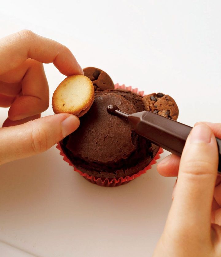 チョコペンを湯につけて柔らかくし、顔の中央に少量絞って、口もと用のクッキーをはりつける。チョコペンで目、鼻、口を描く。