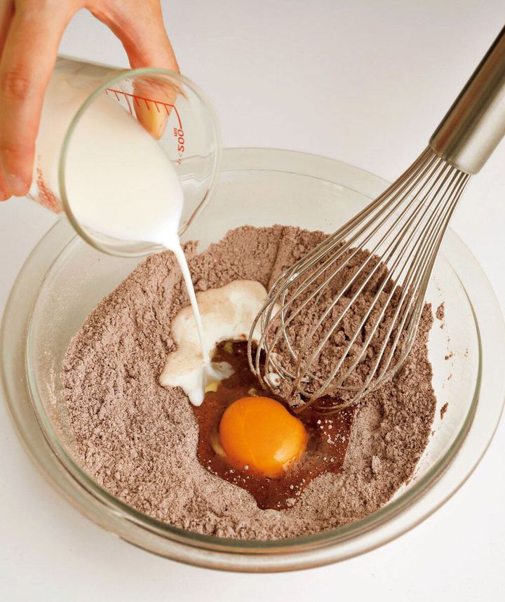 ボールにホットケーキミックス、砂糖、ココアを入れて泡立て器でよく混ぜる。卵、牛乳を加えて混ぜ、溶かしバターを加えてさらによく混ぜる。
