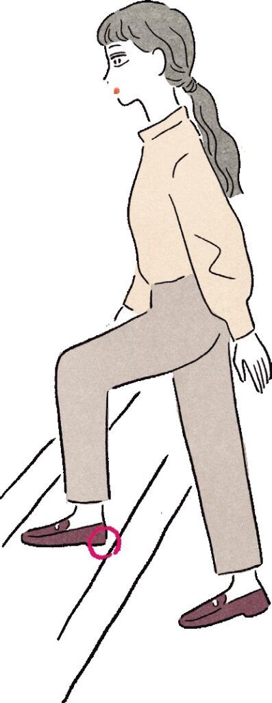 階段はつま先で上ると前ももがハリやすくなり、脚が太く見えてしまう。上半身を少し倒し、背筋を伸ばして必ずかかとから着地するよう意識し、もも裏を刺激。