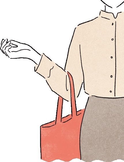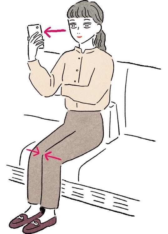 骨盤を立て、内ももを締めて座る。スマホを見る時は、肘に手を添え目の高さに画面を持ってくる。後ろにもたれないよう背中側にバッグを置いてもOK。