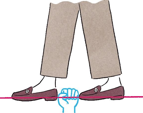 一本の線の上に立つように、左右の足を拳1つ分の間隔をあけて前後させる。足裏全体を地面にぴったりつけると、お尻が自然と引き締まり、体幹も強化される。