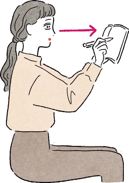 顔の下垂を防ぎたい人は、メモをとる時もなるべく下を向かず、自分の目の高さに紙を持ってくるのがベター。バインダーを使ったり、壁を利用しても。