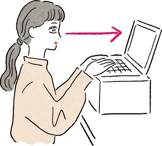 デスクワークで姿勢が崩れてしまいやすいのが、パソコンでの作業中。適度な高さの台をパソコンの下に置き、頭を傾けることなく画面が目に入るように調整。