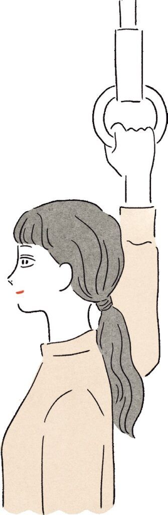 【電車内(立つ場合)】肘を開いて吊り革を持ち、肩甲骨を刺激。