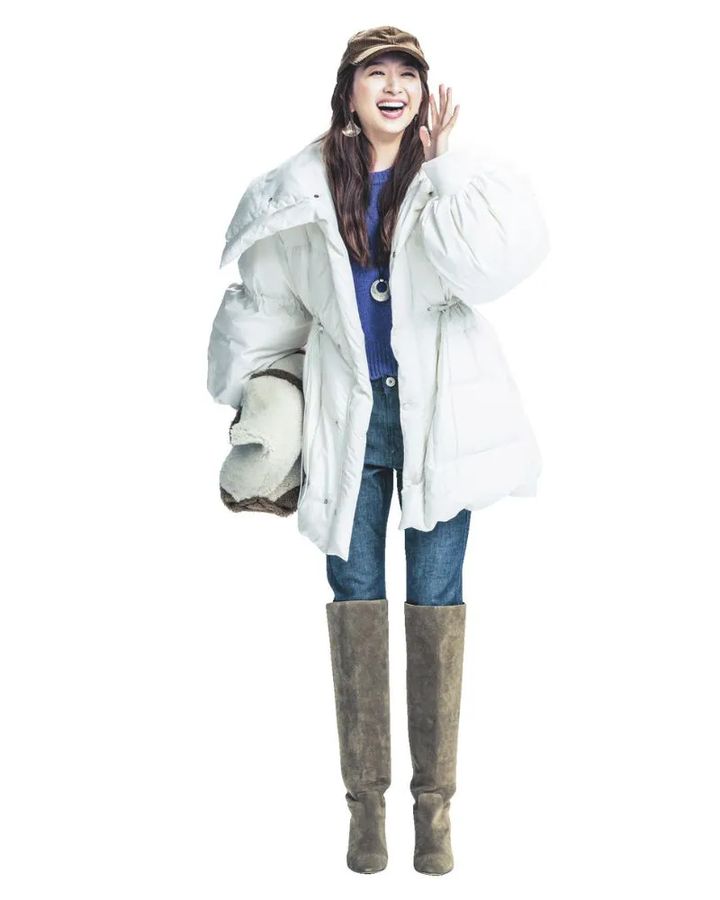 ボリューミーなシルエットのダウンは、ウエストと袖を絞ってシルエットに強弱をつけるのが女性らしく見えるコツ。ロングブーツ×スキニーデニムを合わせることで、脚長効果が叶います。インナーはカラーニットでコーデに遊び心を散りばめて。