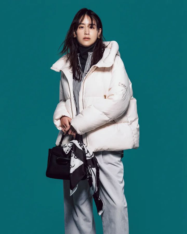 女性らしいしなやかさが備わるシームレスタイプのダウンは、防寒とオシャレを両立させてくれる名品。襟や足元に散りばめたホワイトカラーが、コーデ全体を大人可愛い印象に仕上げてくれます。爽やかなペールブルーのバッグを投入すれば、モノトーンコーデにフェミニンな雰囲気が加わります。