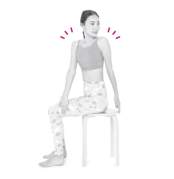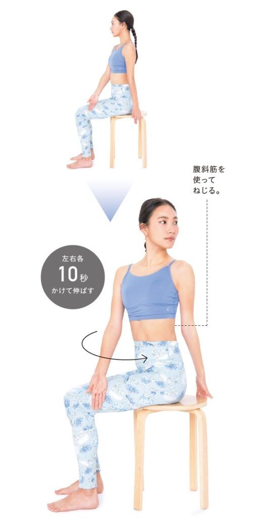 両足を拳1個分ほど開ける。右手を左膝の外側に当てて、左手で椅子のへりを持つ。息を吐きながら、上体を左方向に10秒かけてねじる。この時、左の腹斜筋をおへそに寄せていくような意識で。反対側も同様に。