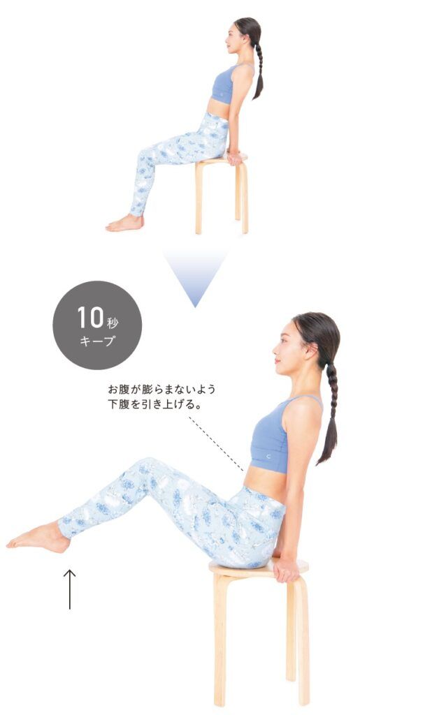 脚をそろえて、両手で椅子の座面をつかむ。背中を伸ばし、上体を後方に倒す。息を吐きながら、両膝をそろえて45度の高さまで持ち上げて10秒キープ。脚がここまで上がらない人は1cmでも1秒でもOK。