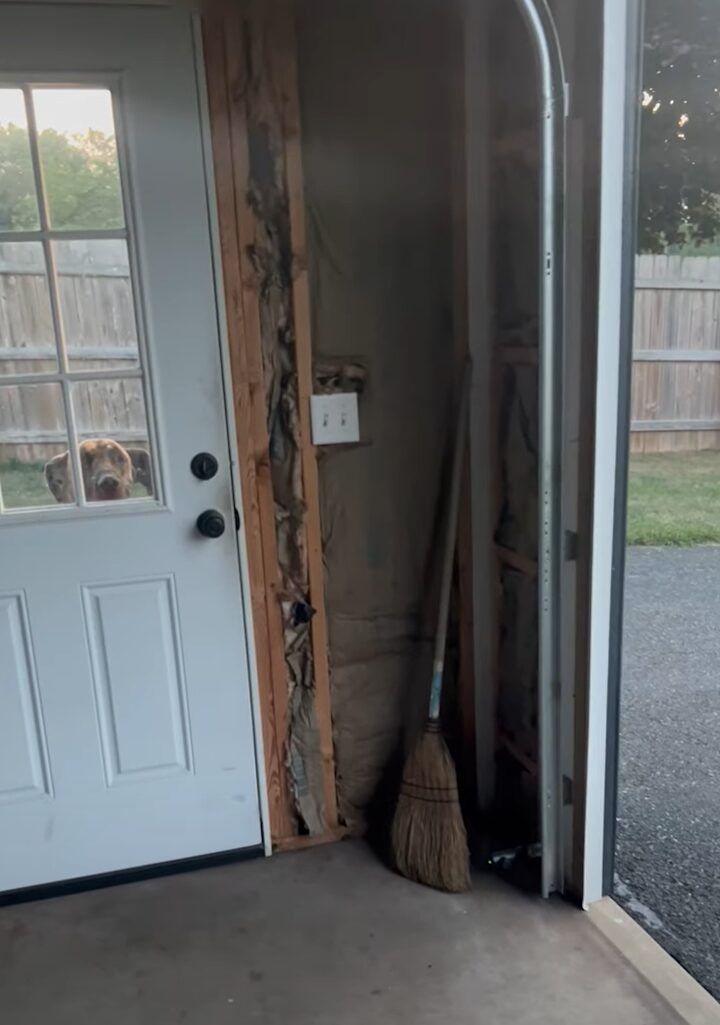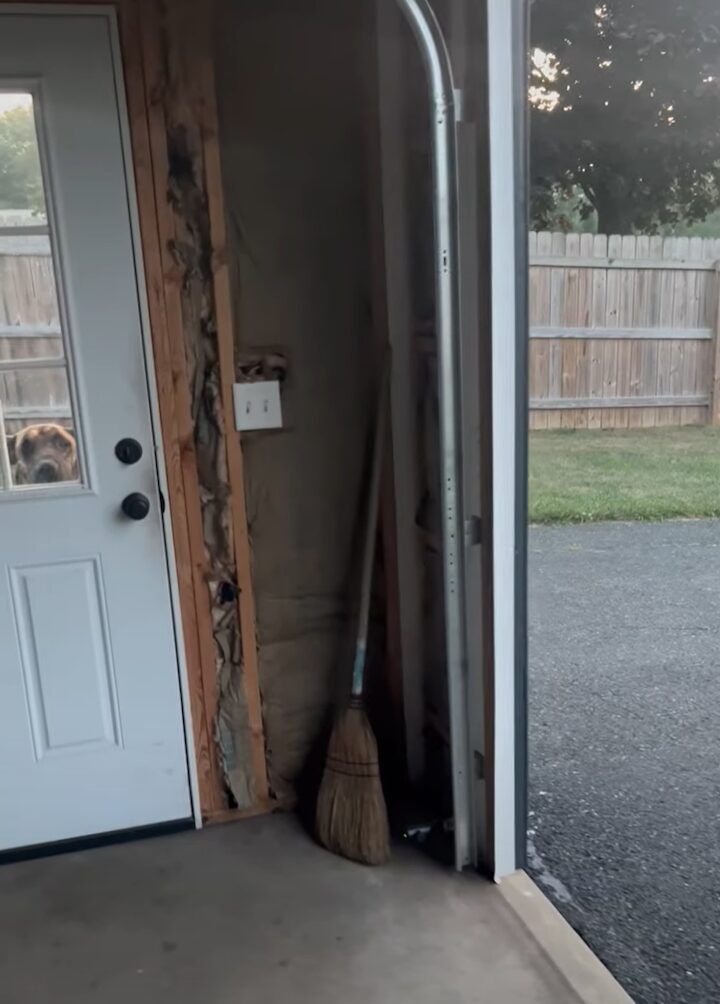 CJくんは、ガレージ横のドアから顔を覗かせていました。 飼い主さんが「CJ!こっちにおいで!」と呼びかけますが・・・ドアが閉まっているので中に入れないみたいです。