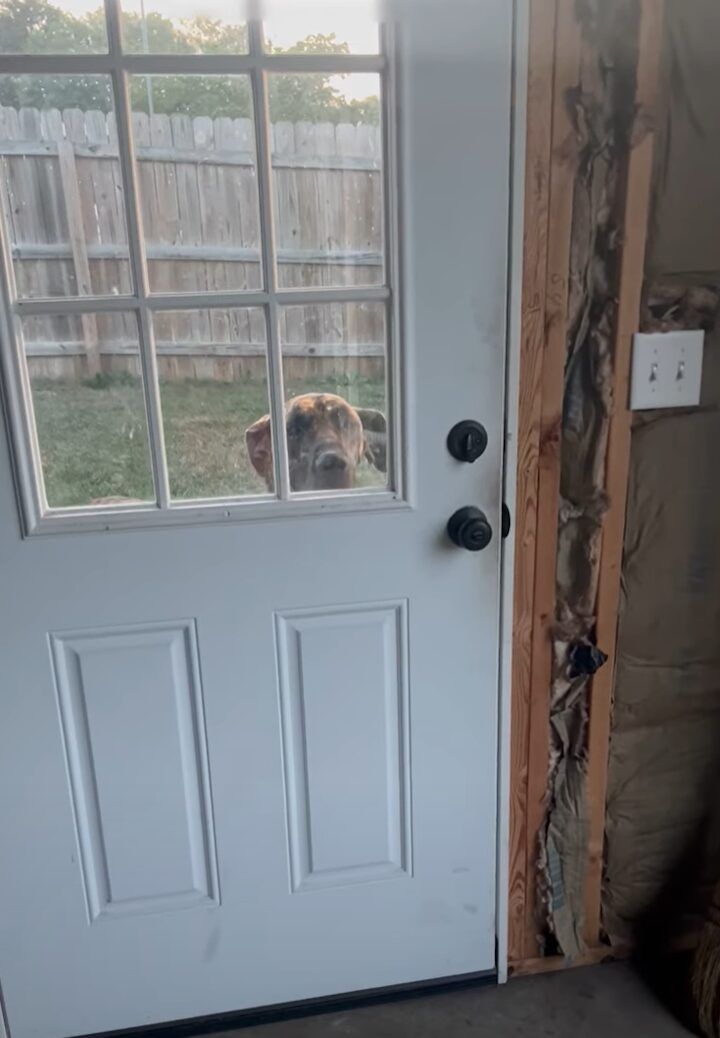 飼い主さんのことをじっと見つめて「ドアを開けて!」とアピールしているグレートデーン。 どうやら、すぐそばにあるガレージのシャッターが開いていることに気付いていないらしく・・・。 待つ必要なんてないんだよ!!