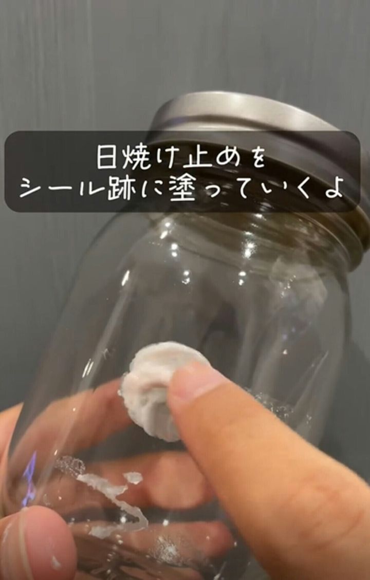 すると、シールの跡はすっきりきれいに落ちています。日焼け止めクリームにこのような力があったとは、知りませんでした。シールの跡が付いているのといないのとでは、同じビンでも随分と印象が違いますよね。