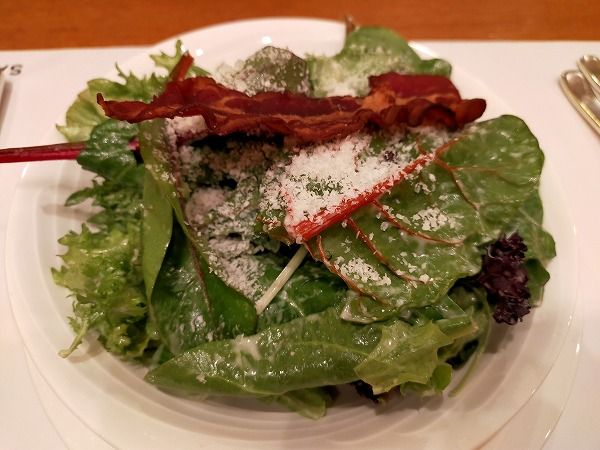 コースのサラダはシーザーサラダ。カリカリに焼かれたベーコンがのったシンプルな一品です。いろいろな種類のリーフに拘りのチーズがたっぷりとかかっていて、高級感のあるサラダです。
