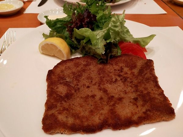 選べるメインは仔牛のカツレツに。出てきてビックリ!超巨大で手のひら2つ分はあると思います。厚みは薄く叩かれてサクサク食感の食べやすいカツレツでした。レモンを絞って爽やかに、終始美味しくいただけました。